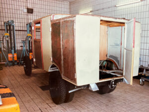 „Wir haben so unsere Mühen mit dem Fahrzeug. Allein die Auspuffanlage muss mit selbstgemachten Rohren irgendwie ‚hineingebastelt‘ werden. Die aus Presspappe verkleidete Inneneinrichtung muss vollständig erneuert werden, ebenso das Holz im Innenausbau.“