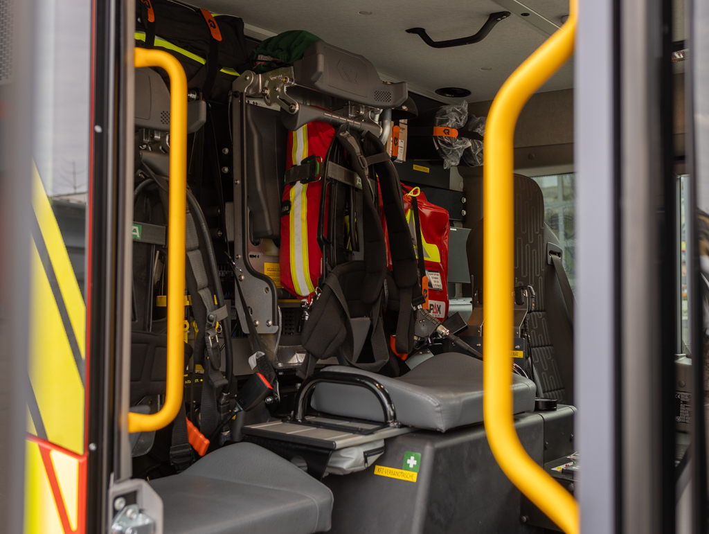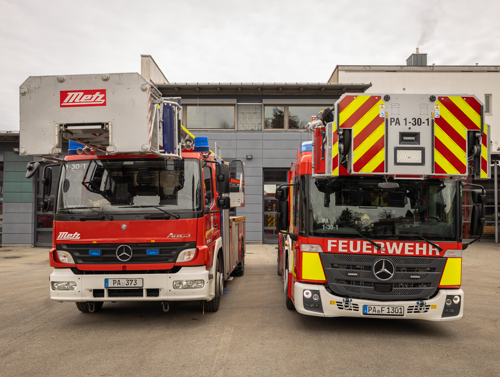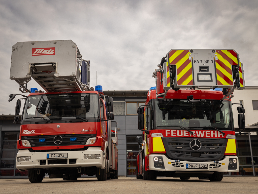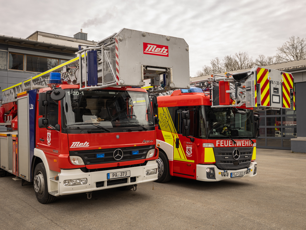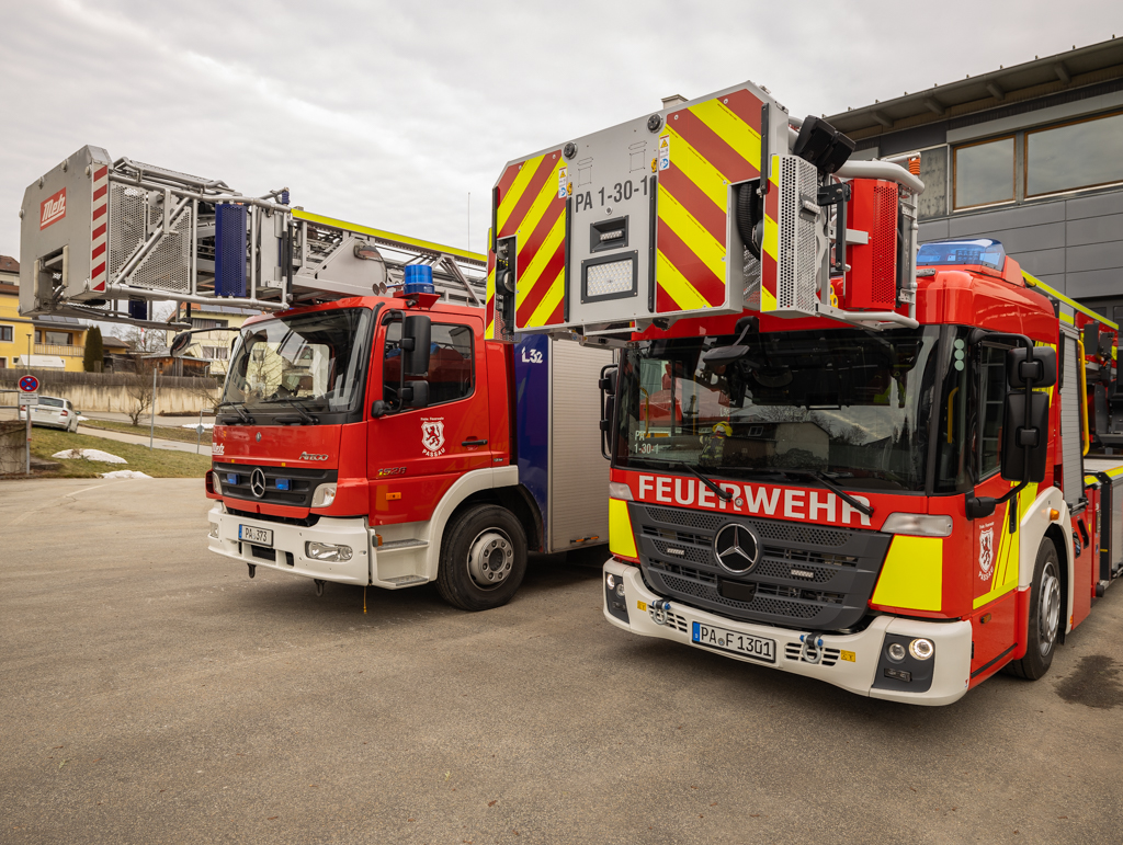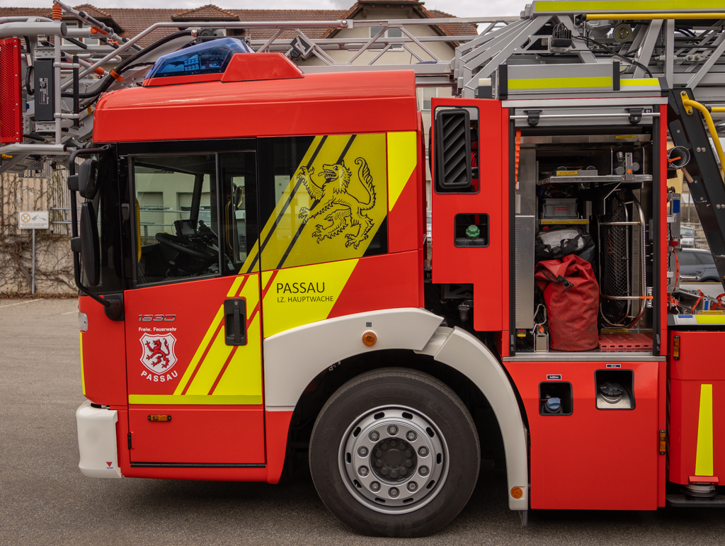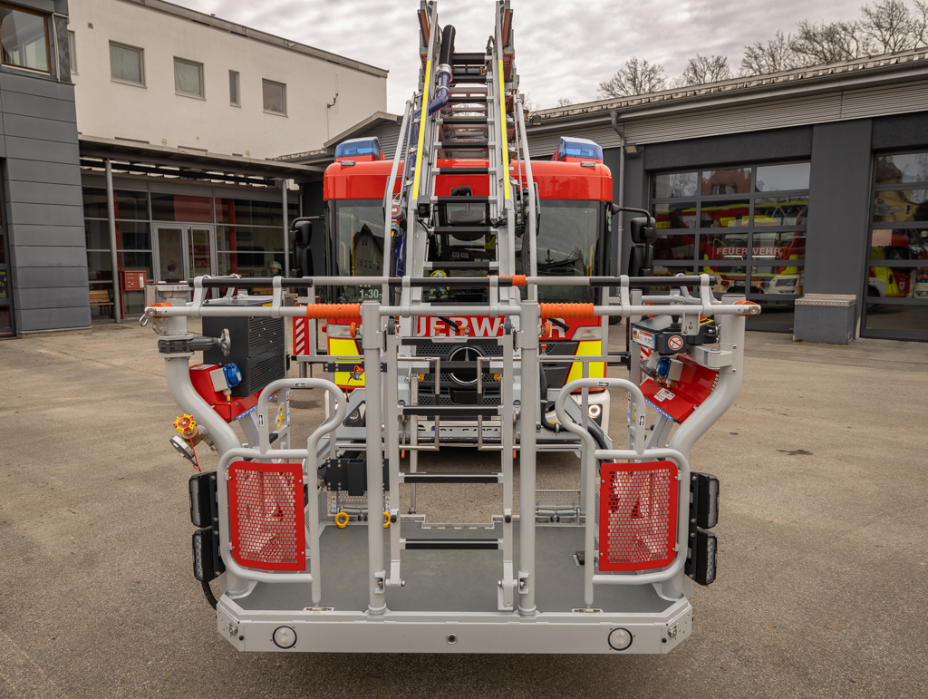 Die Drehleiter wird vor allem zur Rettung von Menschen aus großen Höhen eingesetzt. Die Bezeichnung DLAK 23/12 bedeutet: Drehleiter Automatik mit Korb, 23 Meter Rettungshöhe bei 12 Metern Ausladung. Die maximale Rettungshöhe beträgt 32 Meter. Mit einer Höhe von 3,00 Metern und einer Breite von etwa 2,40 Metern ist unser Fahrzeug kompakter als Standard-Drehleitern. Der Rettungskorb trägt bis zu 500 kg oder fünf Personen. Der Leiterpark besteht aus fünf Teilen, darunter ein 4,5 Meter langer Gelenkarm, der bis zu 70° abgewinkelt werden kann. Eine Hinterachszusatzlenkung erleichtert das Manövrieren an engen Einsatzstellen. Sie kann automatisch oder manuell bedient werden. Für die Brandbekämpfung ist ein Wasserwerfer mit 2000 L/min und ein C-Anschluss für Nachlöscharbeiten vorhanden. Die Wasserzufuhr erfolgt über eine integrierte Leitung und mit einem 30 Meter langen B-Schlauch. Zusätzlich kann am Korb eine Krankentragenhalterung für bis zu 350 kg angebracht werden. Diese kann je nach Situation auf der Reling oder am Korbboden montiert werden. Die Drehleiter wird auch für technische Hilfe wie das Beseitigen von Unwetterschäden genutzt. Dafür sind Absturzsicherungssätze und Kettensägen mit Schutzausrüstung an Bord. Ein weiterer Einsatzbereich ist die Anleiterbereitschaft. Dabei dient die Drehleiter als Fluchtweg für Einsatzkräfte in Gebäuden, falls der reguläre Rückweg versperrt ist.