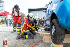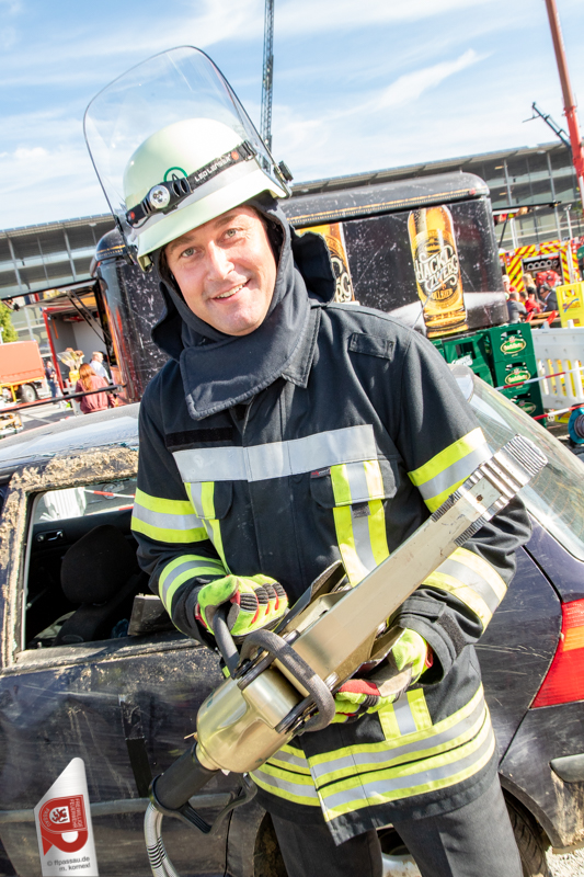 Sich einmal selbst versuchen an Gerätschaften, die Feuerwehrler so einsetzen, war an diesem Tag möglich. Auch Minister Andreas Scheuer versuchte sich an schwerem Gerät. Er entfernte unter fachlicher Anleitung eine Tür aus einem angenommen verunfallten Fahrzeug mittels hydraulischen Rettungssatzes.