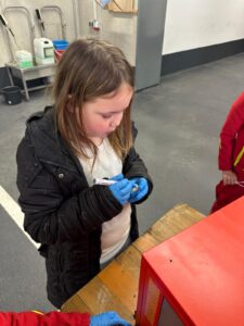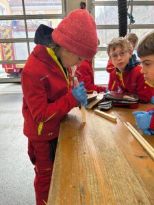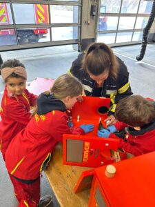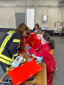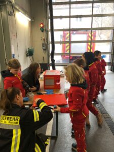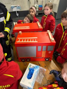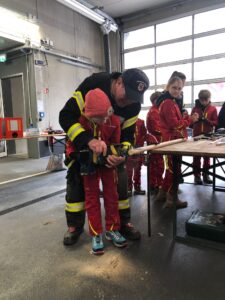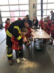 Der Bau wurde natürlich mit Werkzeugen, die auf den Feuerwehrautos verlastet sind, durchgeführt. So konnten sich die Kinder im Alter von 8-11 Jahren einmal an einer Säbelsäge oder einem Akkuschrauber ausprobieren und waren dabei Feuer und Flamme die Gerätschaften der Erwachsenen selbst in Händen zu halten. Diese mussten natürlich erstmal im Löschgruppenfahrzeug gefunden werden. Selbstredend wurden auch Themen wie die persönliche Schutzkleidung besprochen und Sonderschutzausrüstung wie die Schutzbrillen gegen Staub, die Atemmasken zum Schutz vor den Lackdämpfen oder die Wirksamkeit von Schutzhandschuhen besprochen. Die Anleitung und Begleitung erfolgte von einem Team aus erfahrenen Feuerwehrfrauen und -männern.