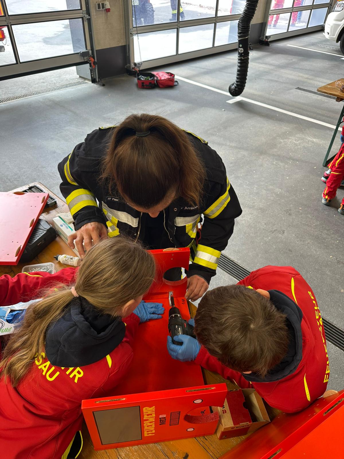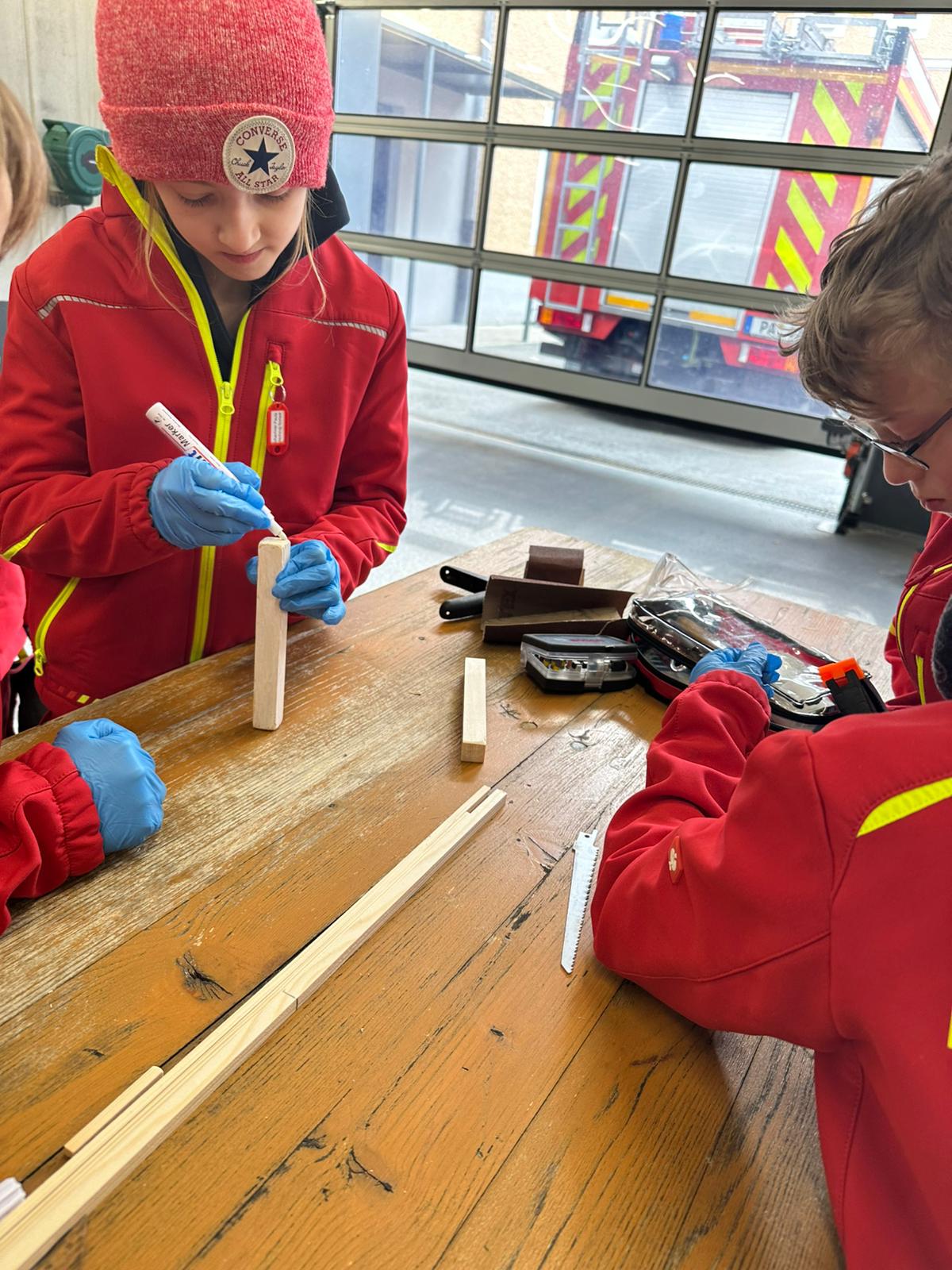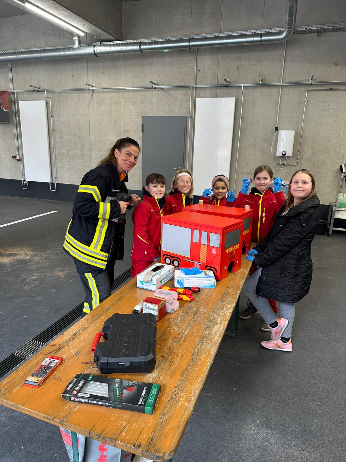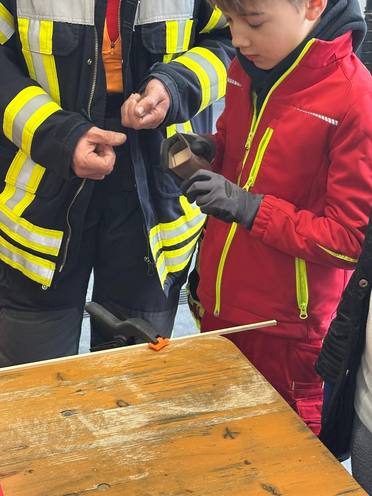 Der Bau wurde natürlich mit Werkzeugen, die auf den Feuerwehrautos verlastet sind, durchgeführt. So konnten sich die Kinder im Alter von 8-11 Jahren einmal an einer Säbelsäge oder einem Akkuschrauber ausprobieren und waren dabei Feuer und Flamme die Gerätschaften der Erwachsenen selbst in Händen zu halten. Diese mussten natürlich erstmal im Löschgruppenfahrzeug gefunden werden. Selbstredend wurden auch Themen wie die persönliche Schutzkleidung besprochen und Sonderschutzausrüstung wie die Schutzbrillen gegen Staub, die Atemmasken zum Schutz vor den Lackdämpfen oder die Wirksamkeit von Schutzhandschuhen besprochen. Die Anleitung und Begleitung erfolgte von einem Team aus erfahrenen Feuerwehrfrauen und -männern.