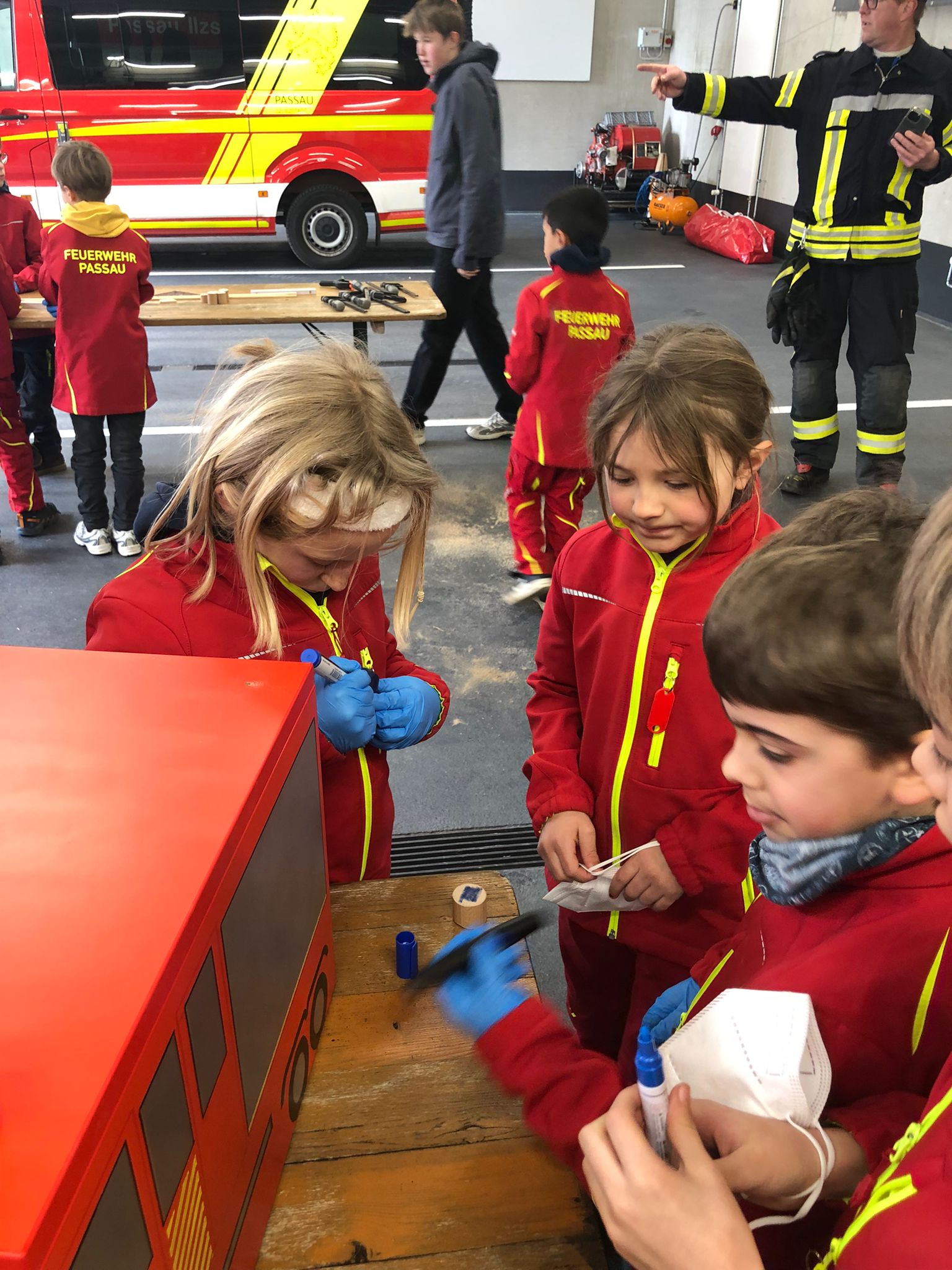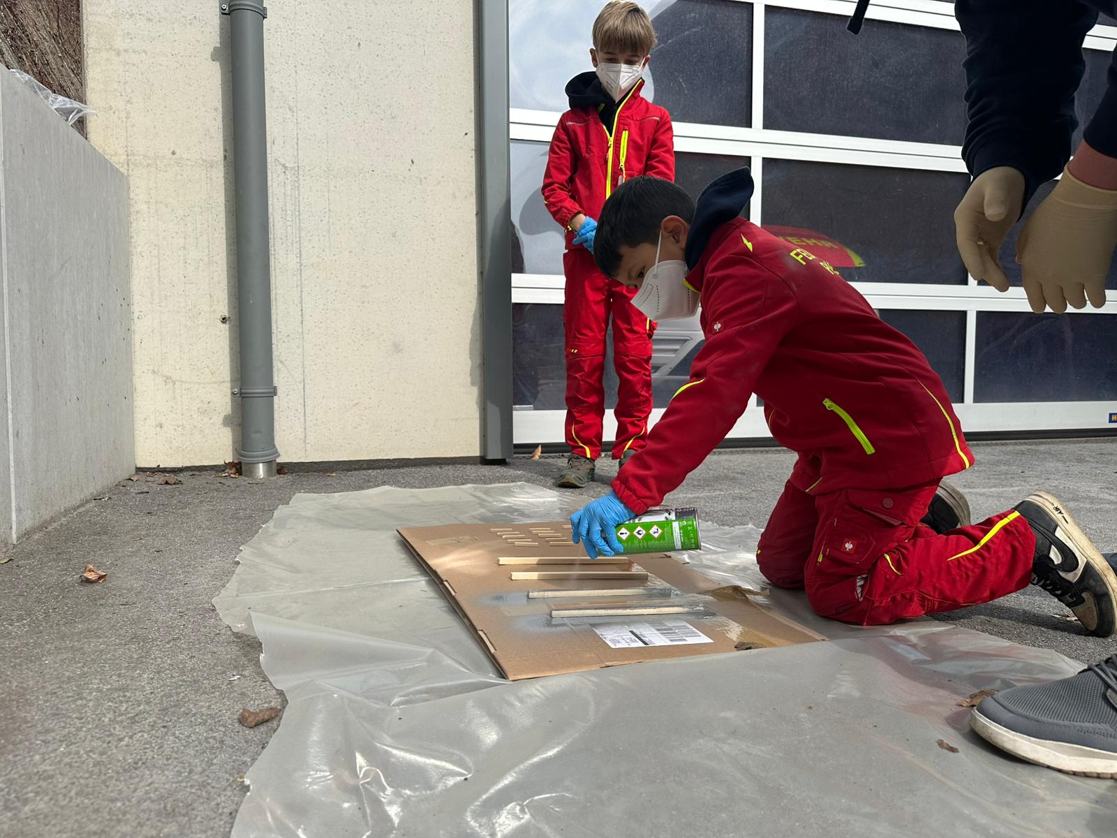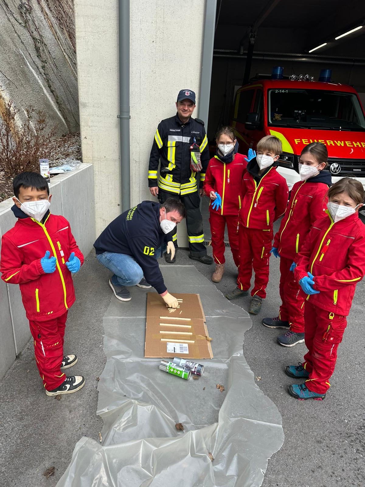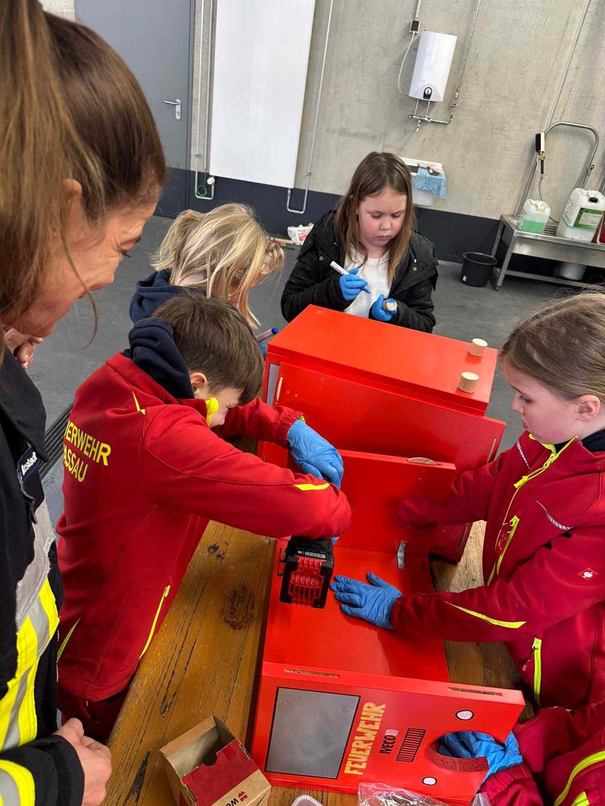 Der Bau wurde natürlich mit Werkzeugen, die auf den Feuerwehrautos verlastet sind, durchgeführt. So konnten sich die Kinder im Alter von 8-11 Jahren einmal an einer Säbelsäge oder einem Akkuschrauber ausprobieren und waren dabei Feuer und Flamme die Gerätschaften der Erwachsenen selbst in Händen zu halten. Diese mussten natürlich erstmal im Löschgruppenfahrzeug gefunden werden. Selbstredend wurden auch Themen wie die persönliche Schutzkleidung besprochen und Sonderschutzausrüstung wie die Schutzbrillen gegen Staub, die Atemmasken zum Schutz vor den Lackdämpfen oder die Wirksamkeit von Schutzhandschuhen besprochen. Die Anleitung und Begleitung erfolgte von einem Team aus erfahrenen Feuerwehrfrauen und -männern.