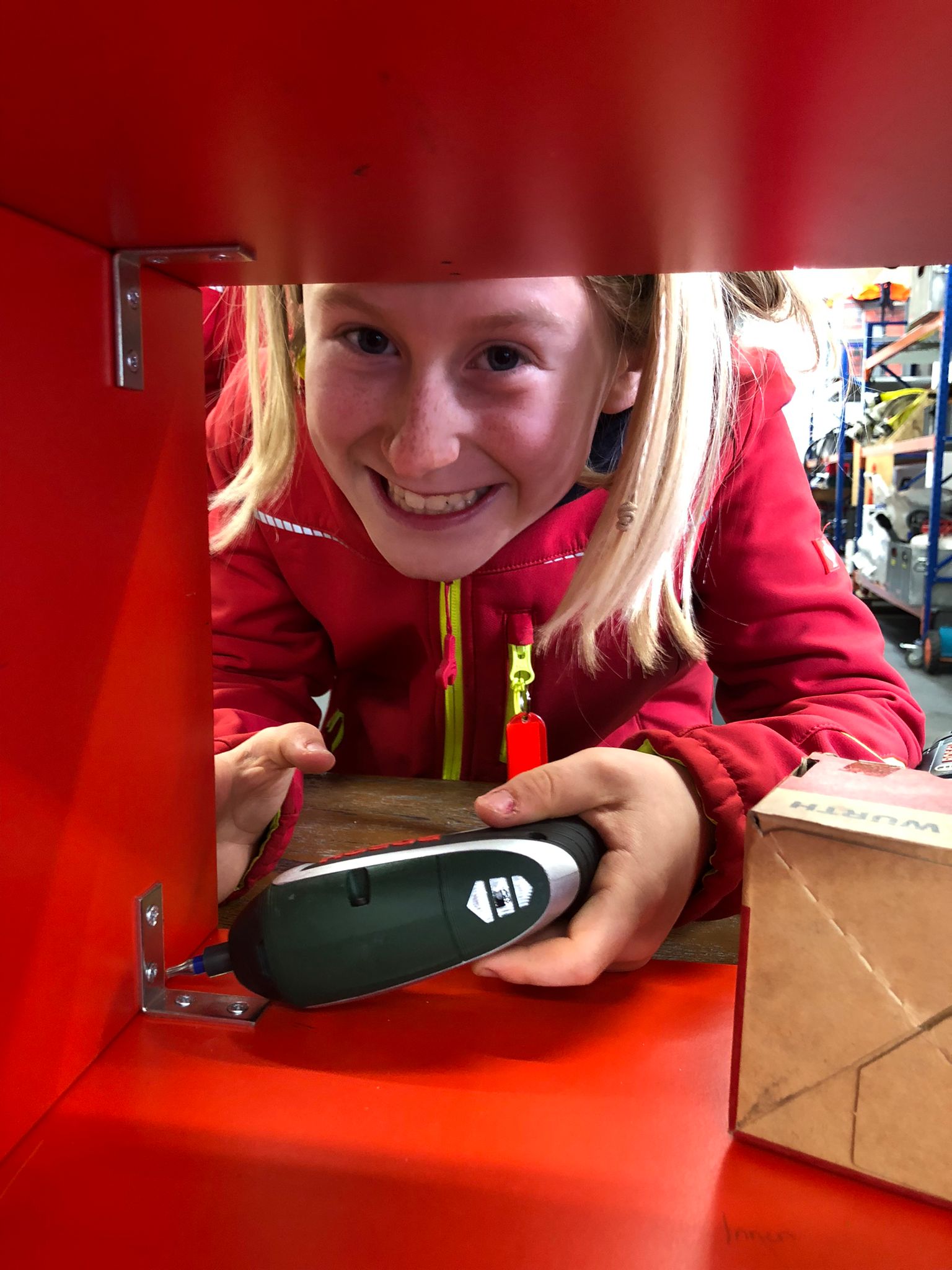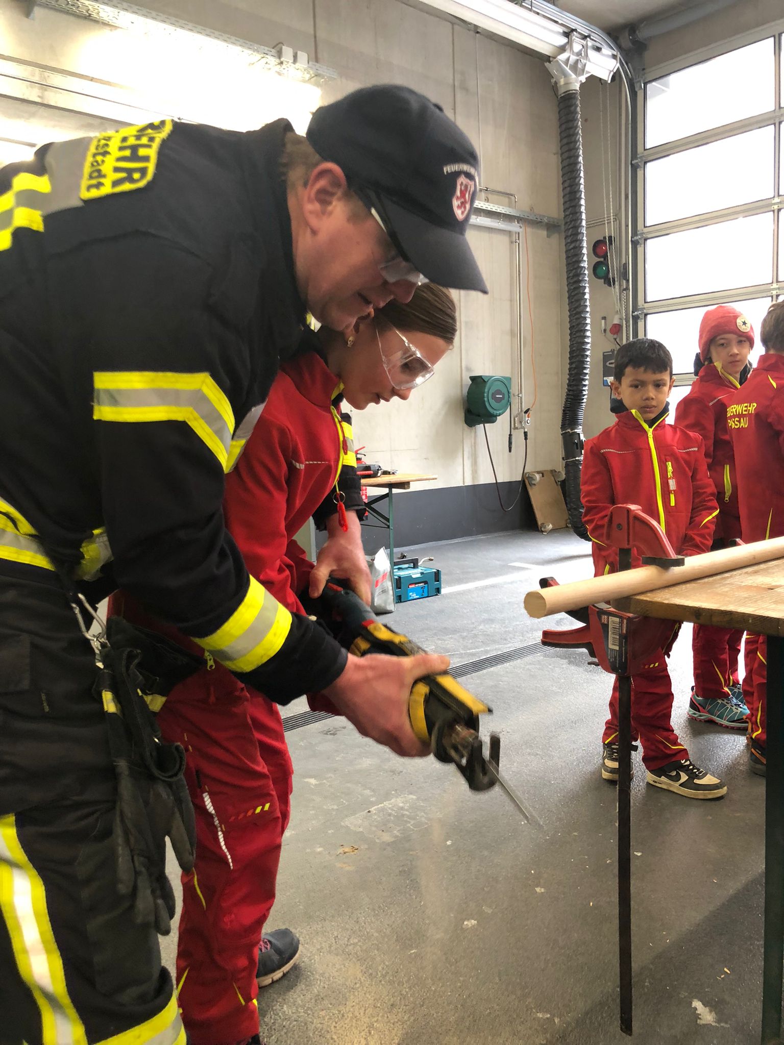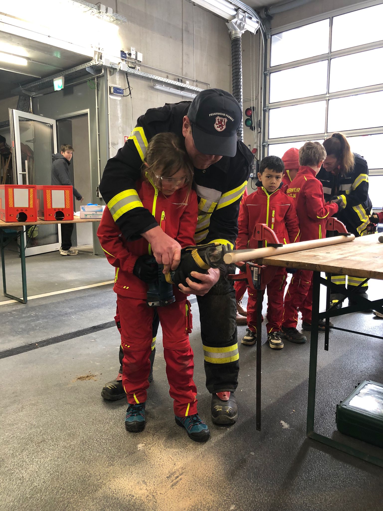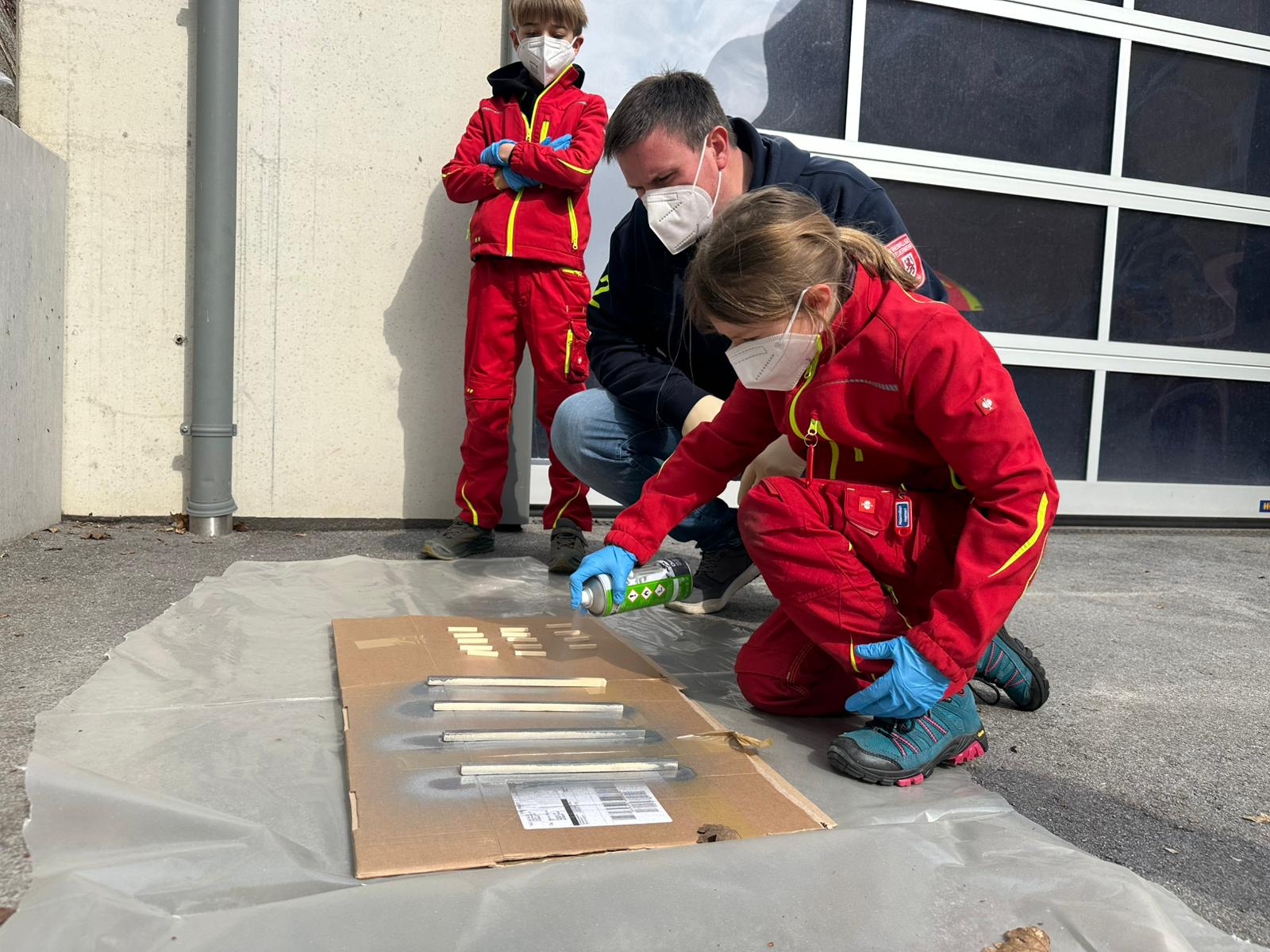 Der Bau wurde natürlich mit Werkzeugen, die auf den Feuerwehrautos verlastet sind, durchgeführt. So konnten sich die Kinder im Alter von 8-11 Jahren einmal an einer Säbelsäge oder einem Akkuschrauber ausprobieren und waren dabei Feuer und Flamme die Gerätschaften der Erwachsenen selbst in Händen zu halten. Diese mussten natürlich erstmal im Löschgruppenfahrzeug gefunden werden. Selbstredend wurden auch Themen wie die persönliche Schutzkleidung besprochen und Sonderschutzausrüstung wie die Schutzbrillen gegen Staub, die Atemmasken zum Schutz vor den Lackdämpfen oder die Wirksamkeit von Schutzhandschuhen besprochen. Die Anleitung und Begleitung erfolgte von einem Team aus erfahrenen Feuerwehrfrauen und -männern.